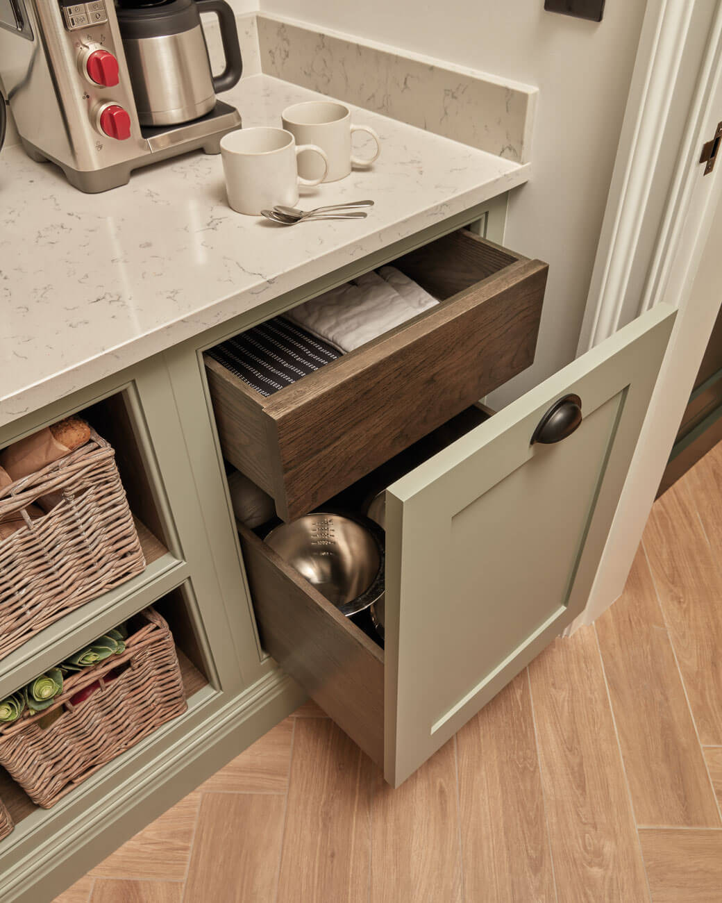We believe that storage should be beautiful and functional. Perfectly crafted open shelving with well-proportioned brackets and robust materials ensures it meets the demands of a well-used kitchen while maintaining an understated elegance, typical of Tom Howley. Our gorgeous dovetail drawers come in all kinds of configurations meaning there’s always an option to suit you. Timber dowels are perfectly formed so you can hang your favourite utensils so they’re ready to use at a moment’s notice.