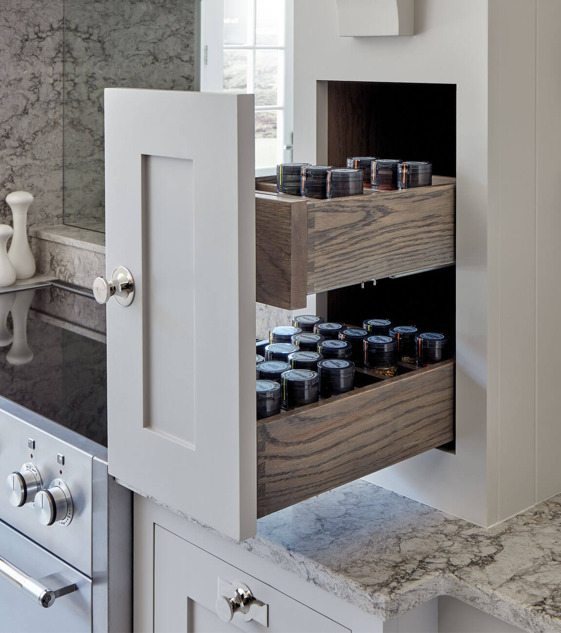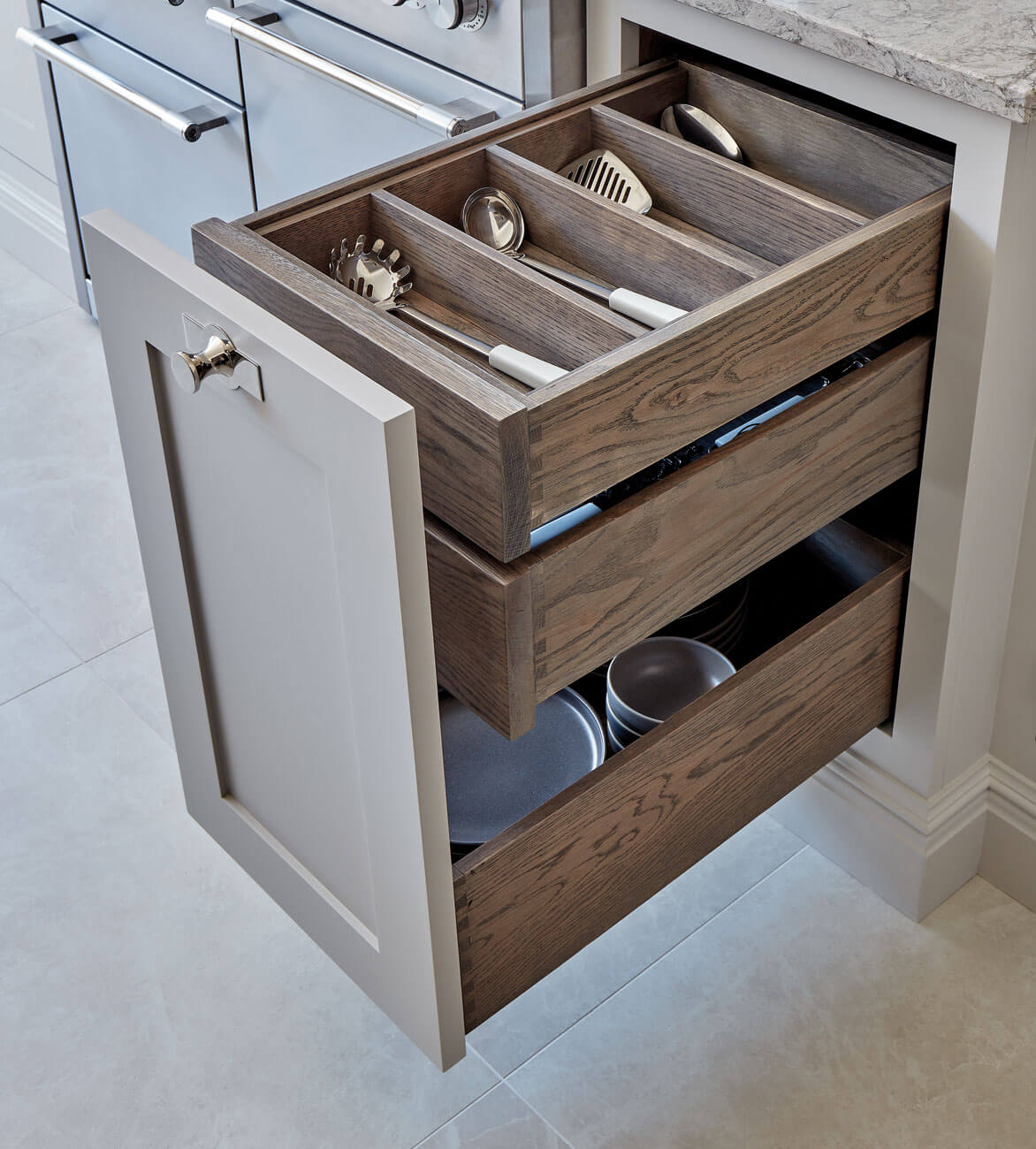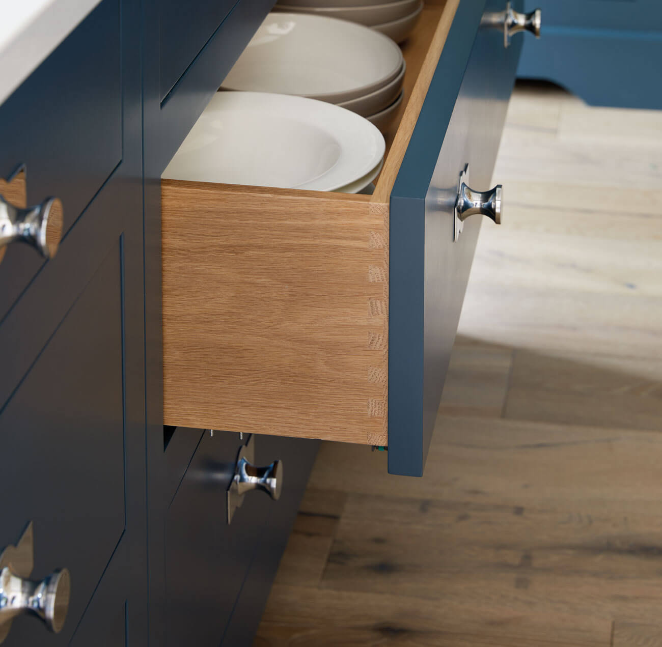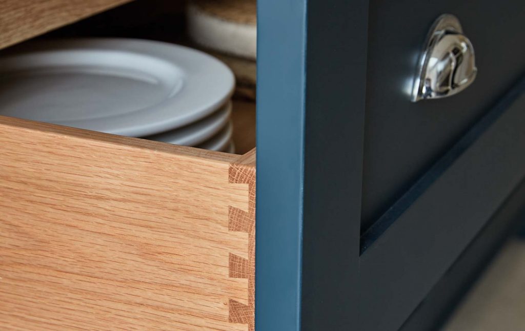 Not only attractive, dovetail joints are extremely strong and durable, thanks to their specialised design. Near impossible to pull apart, the interlocking pins and tails form a sturdy and long-lasting joint that helps to ensure your Tom Howley kitchen will stand the test of time.