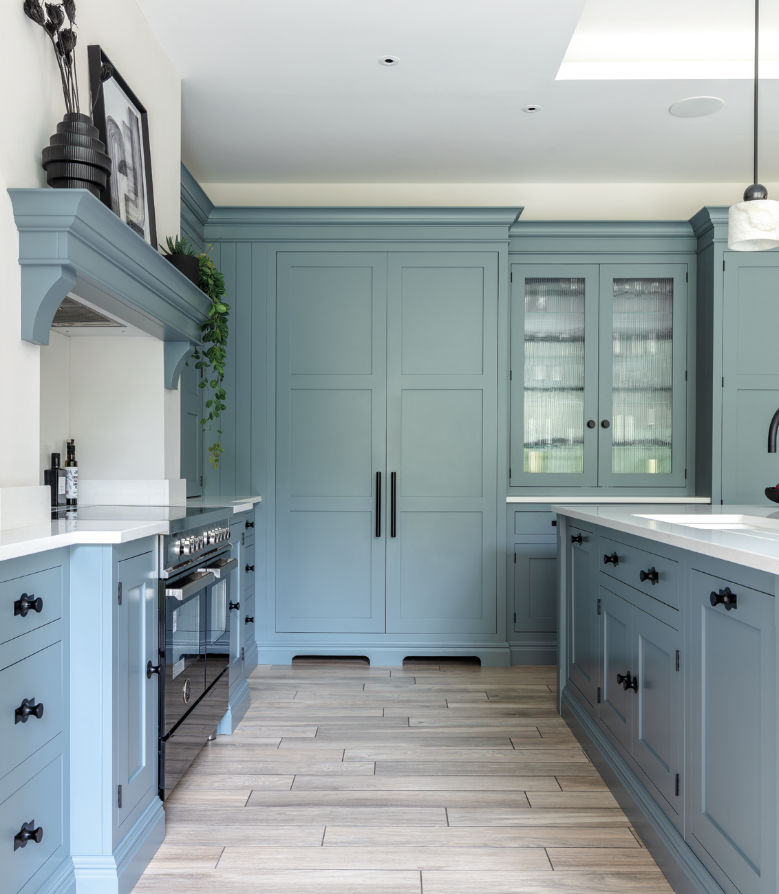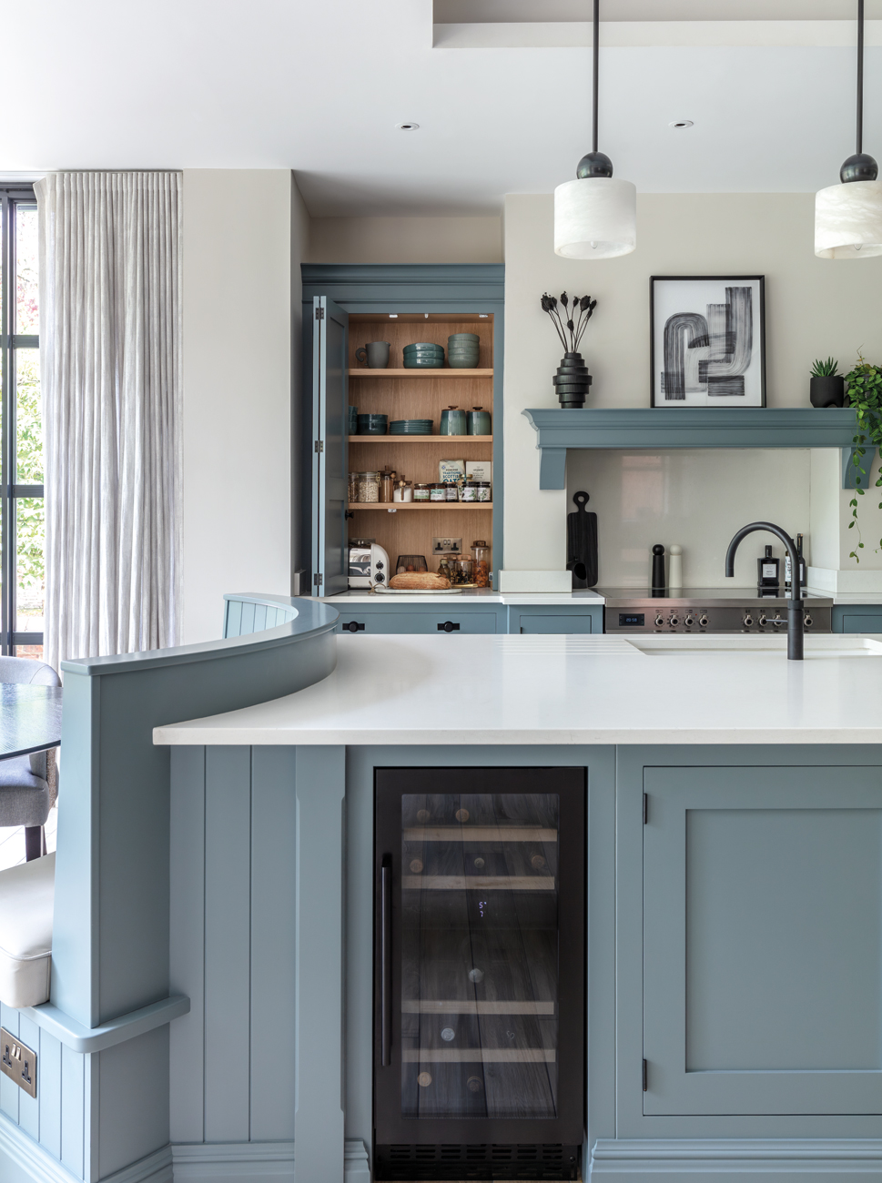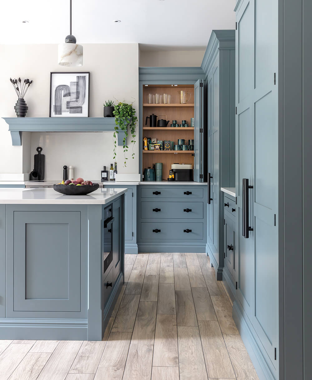 The kitchen’s beauty is rooted in its carefully curated colour palette and premium finishes. Our exclusive paint colour, Azurite, sets the tone, infusing the space with a calm yet bold presence. This relaxed blue shade, with its hints of grey and green undertones, creates a grounded atmosphere while adding a pop of visual interest that lifts the heart of the home.