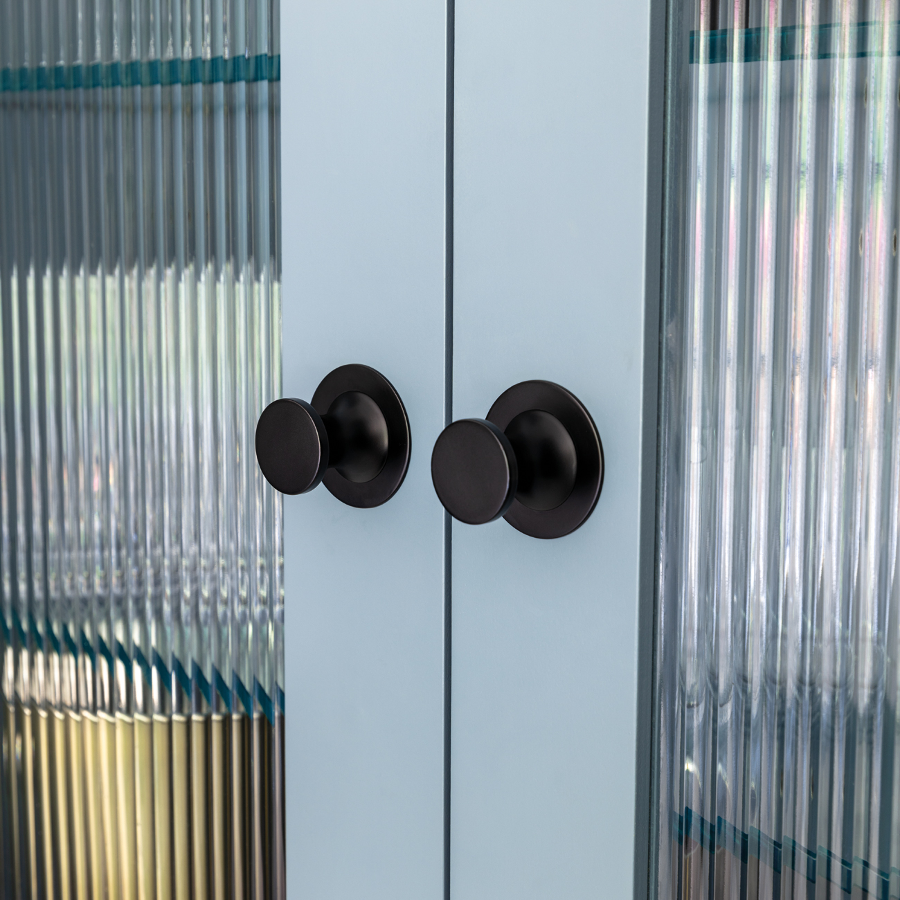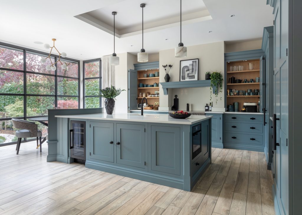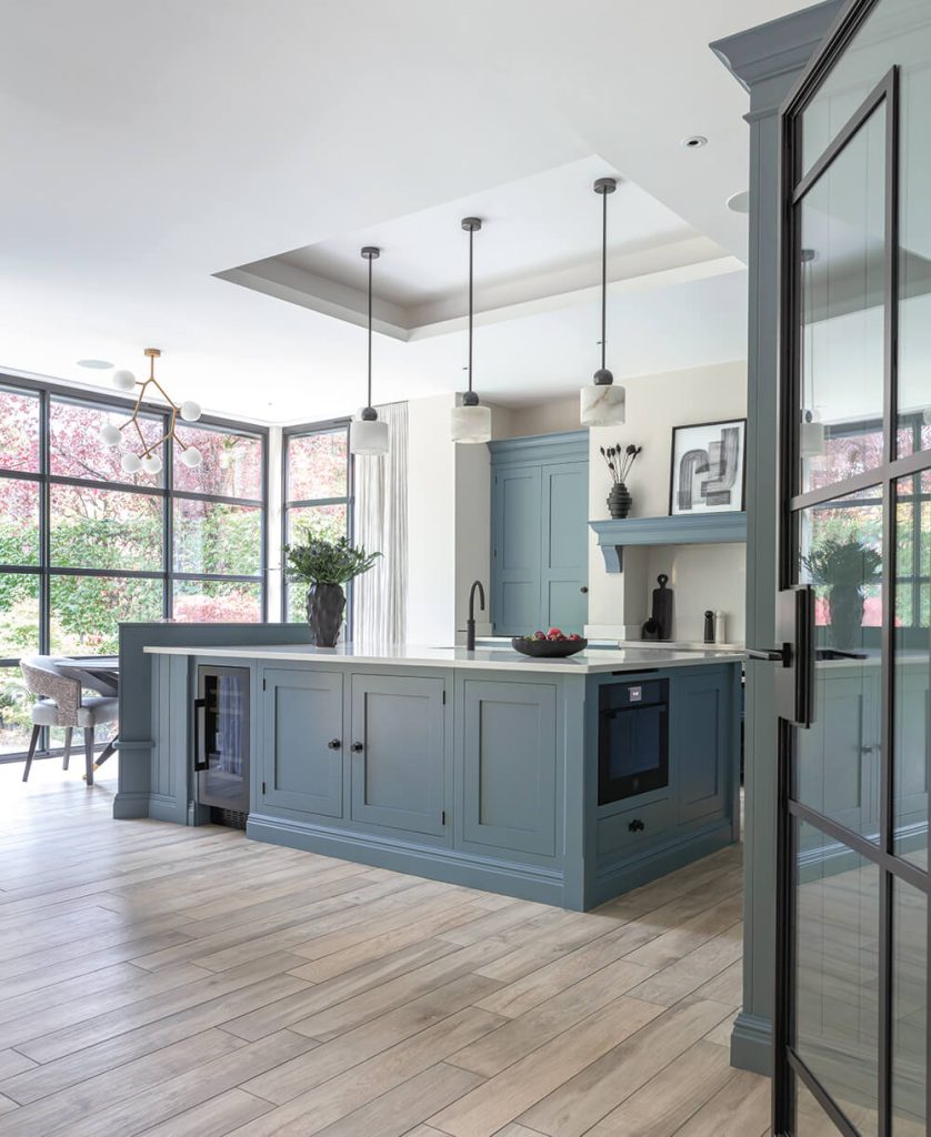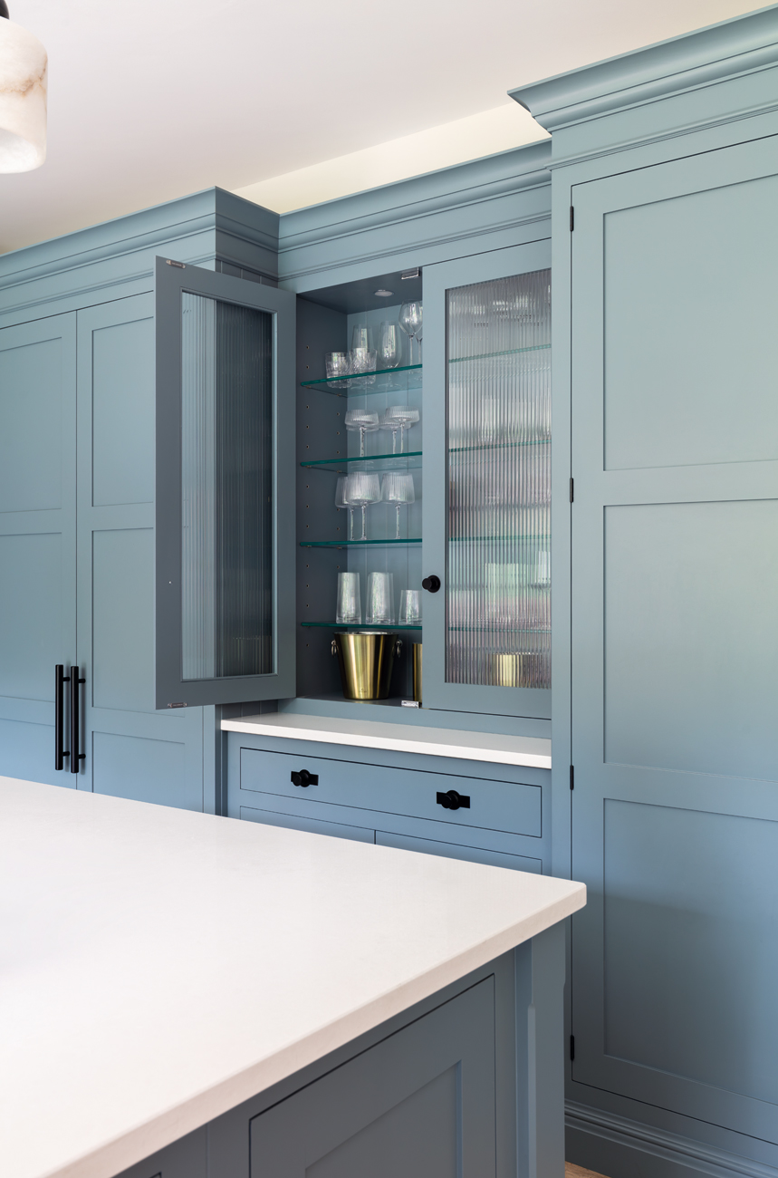 The kitchen’s beauty is rooted in its carefully curated colour palette and premium finishes. Our exclusive paint colour, Azurite, sets the tone, infusing the space with a calm yet bold presence. This relaxed blue shade, with its hints of grey and green undertones, creates a grounded atmosphere while adding a pop of visual interest that lifts the heart of the home.