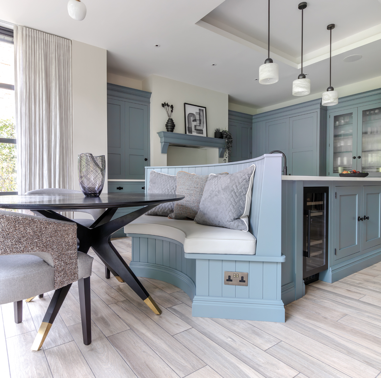 One standout feature is the larger-than-life island. Acting as the room’s centrepiece and social hub, it boasts bespoke curved bench seating, integrated storage, and even a MQuvee wine fridge. Whether used for casual family meals, homework sessions, or evening entertaining, this island is a testament to blending form and function.