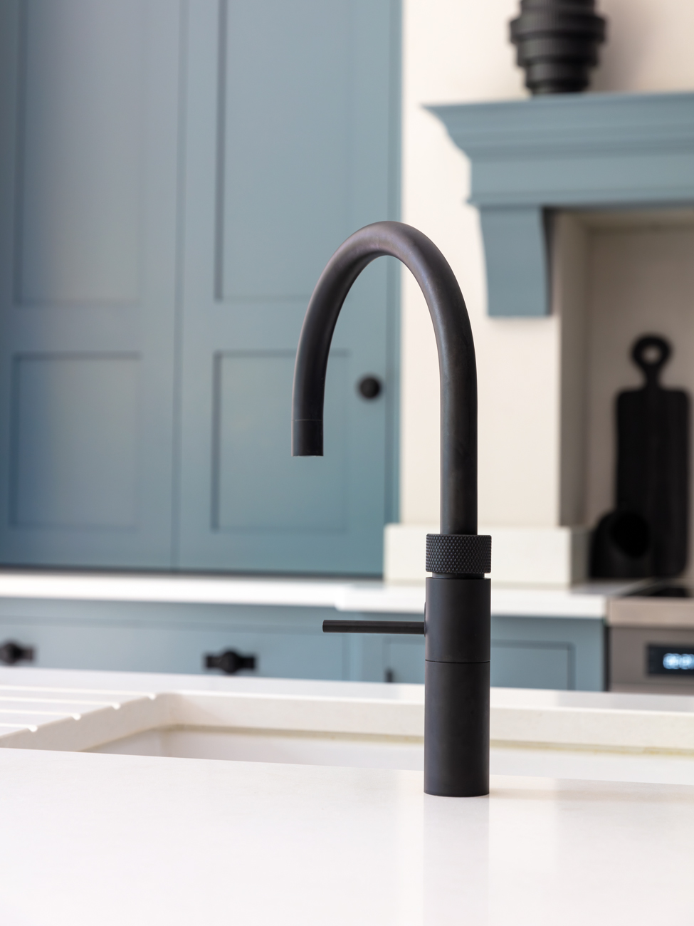 When paired with wood tones and Caesarstone Organic White worktops, the palette perfectly balances warmth and modernity. Matt black handles and fixtures, including the Quooker tap, further enhance the room’s contemporary aesthetic while harmonising with the Crittall window and door details.