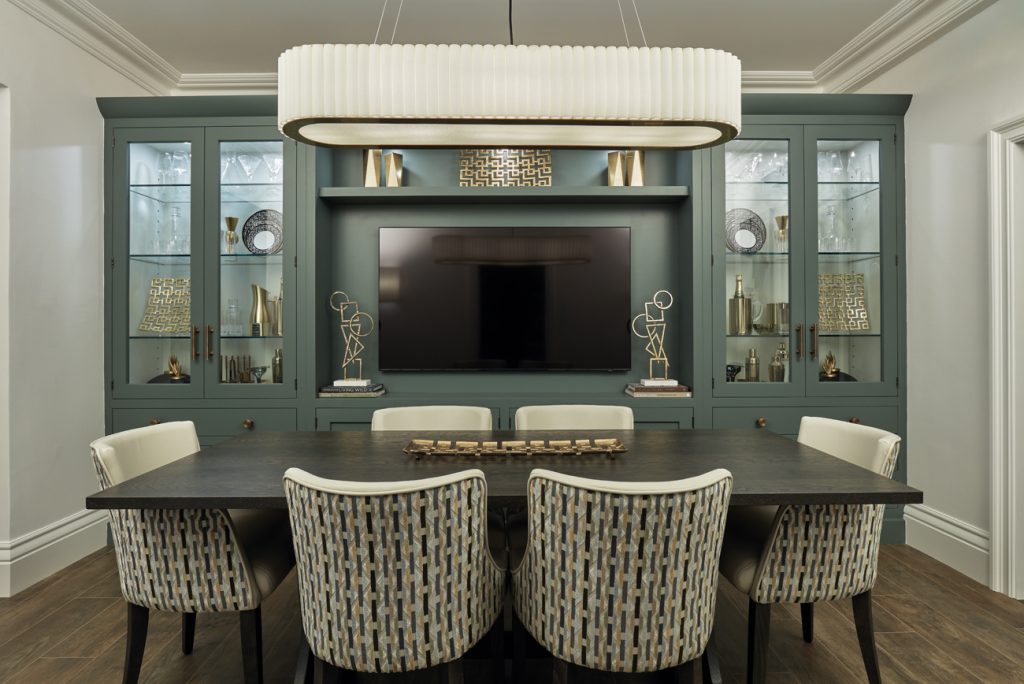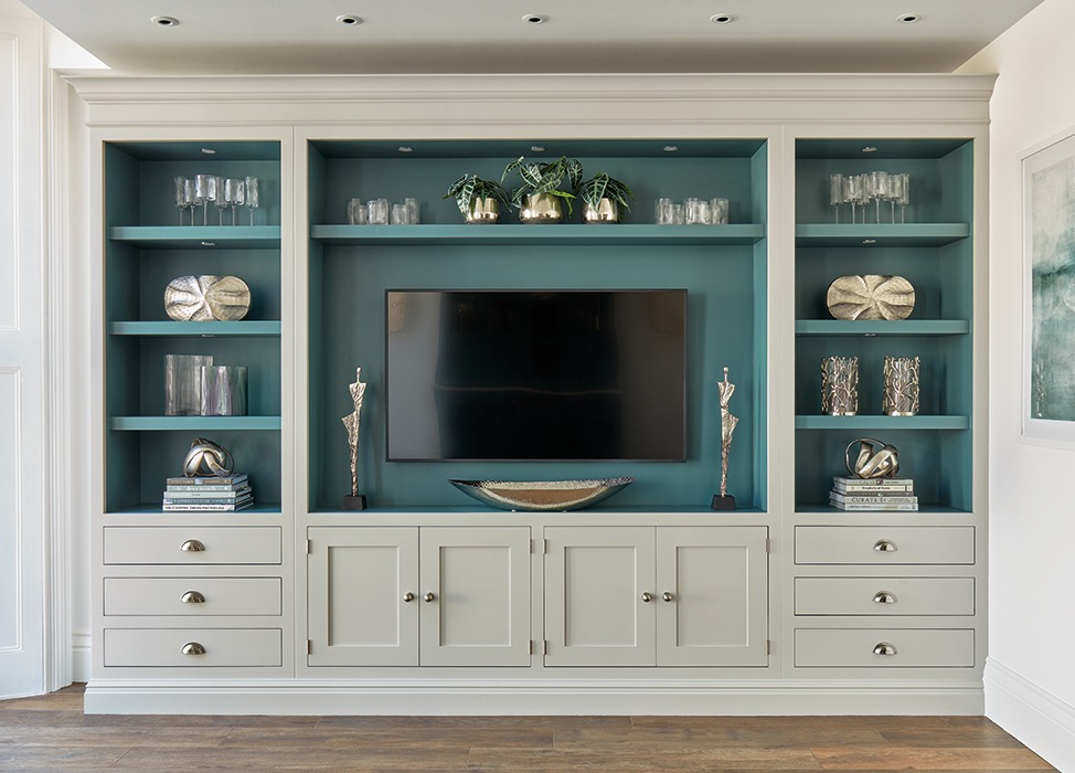 This breathtaking bespoke built-in media wall features our new, exclusive paint colours, Green Meadow and Hazy Sky, which bring a fresh and serene vibe to the design. Soft illumination from the glazed cabinets bathes the space, creating the perfect atmosphere for relaxation and enjoyment.