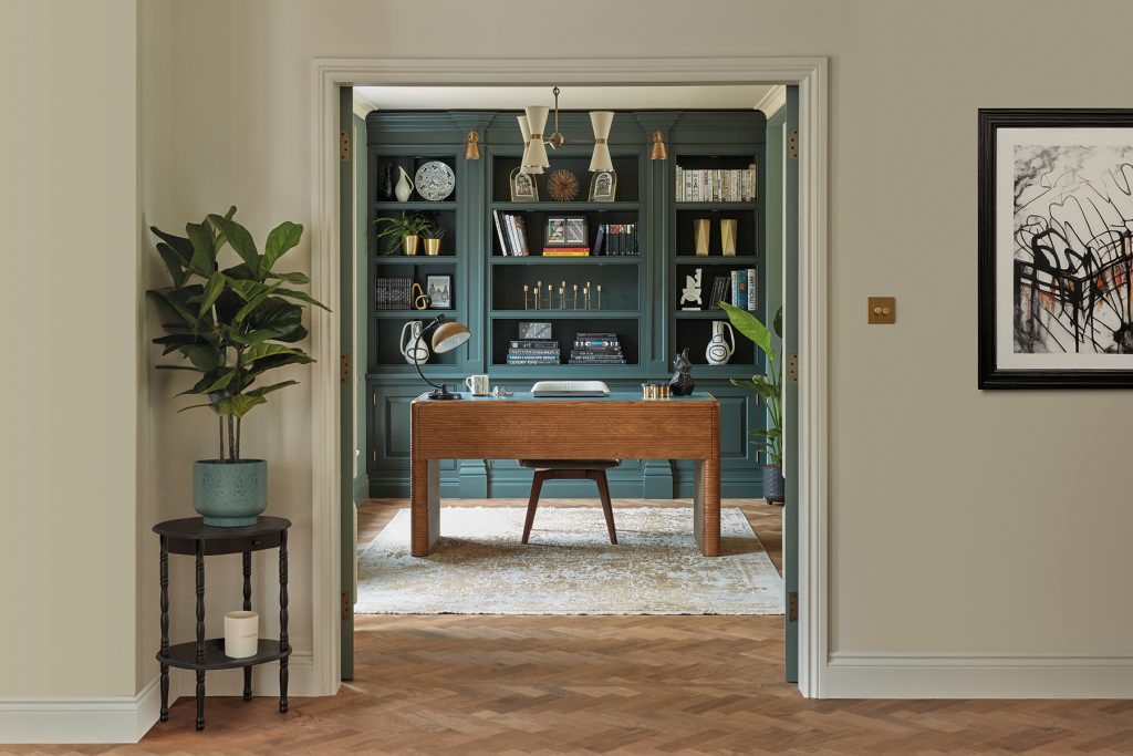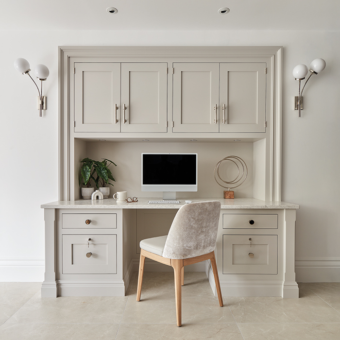Painted in our timeless muted shade, Tansy, this study features Antrim polished nickel handles, integrated lighting, secure cabinets, and a quartz worktop, exemplifying the Butler collection’s clean, elegant design.