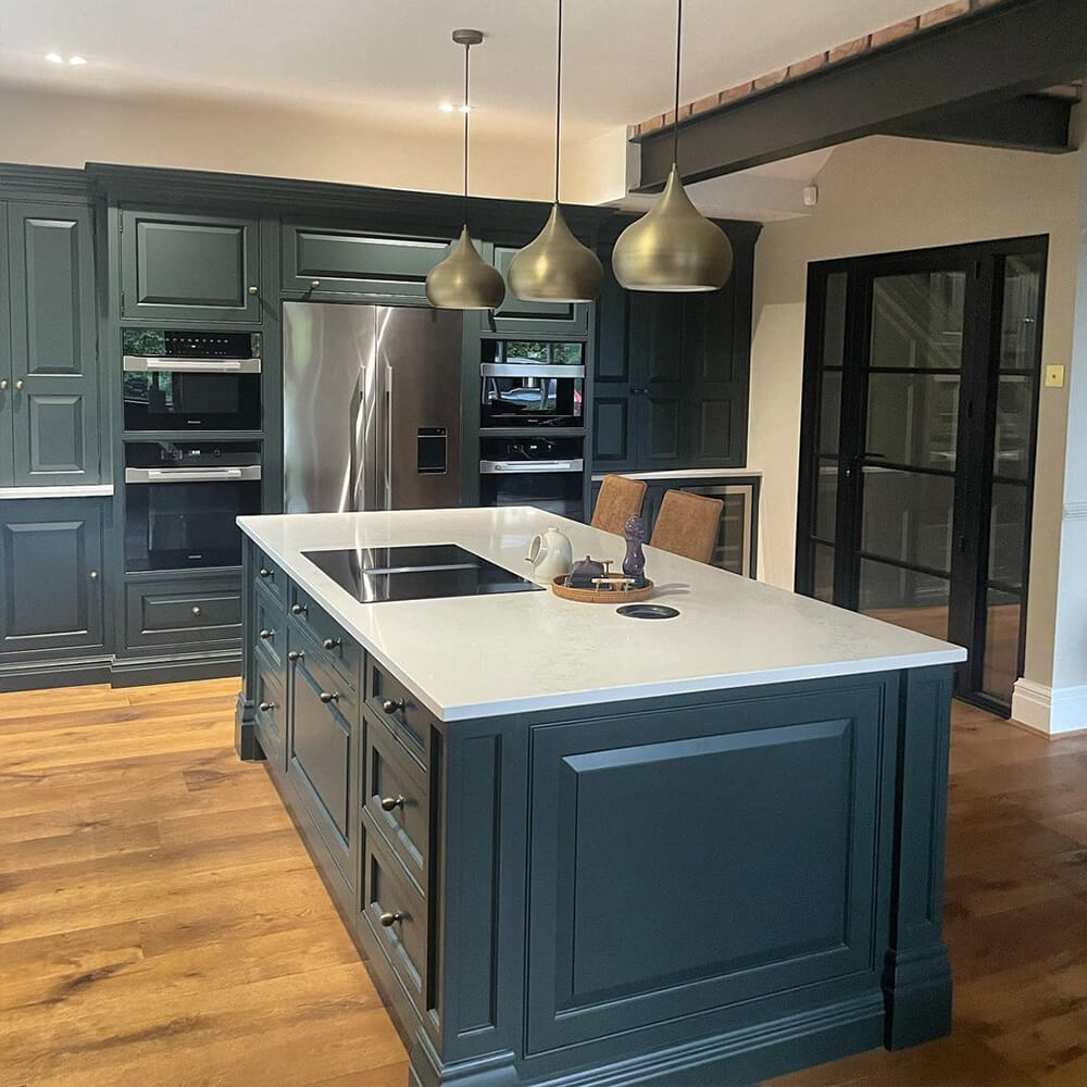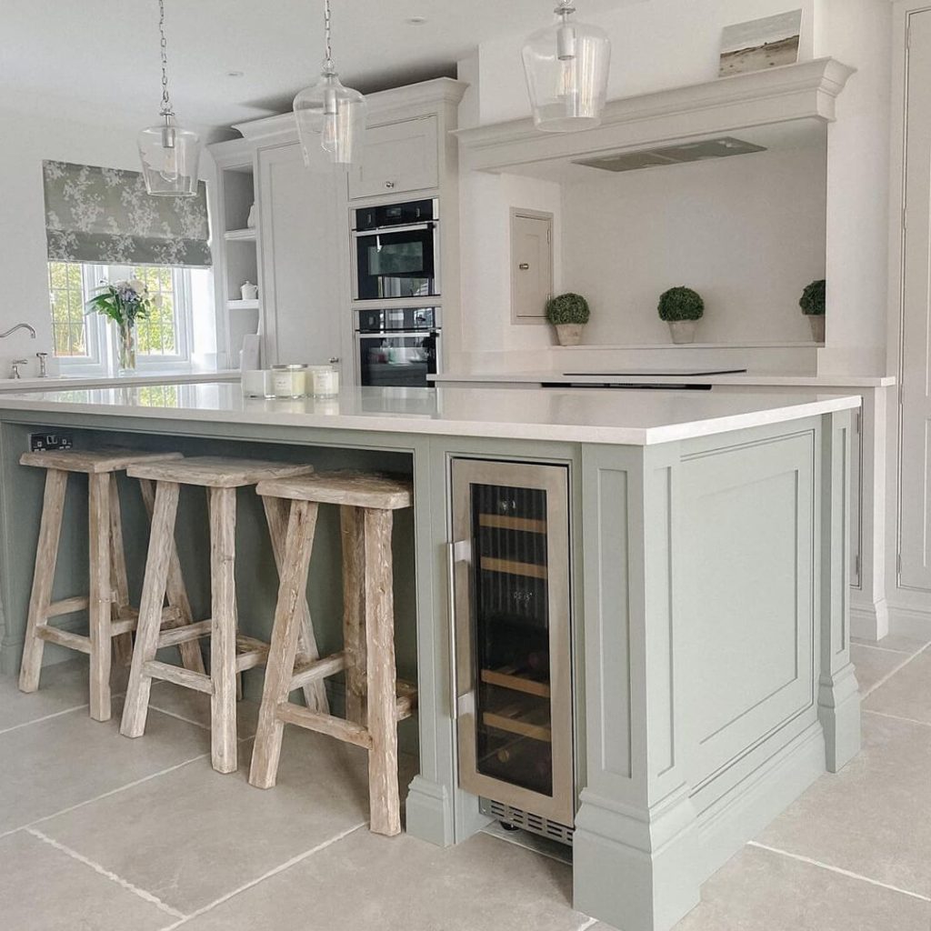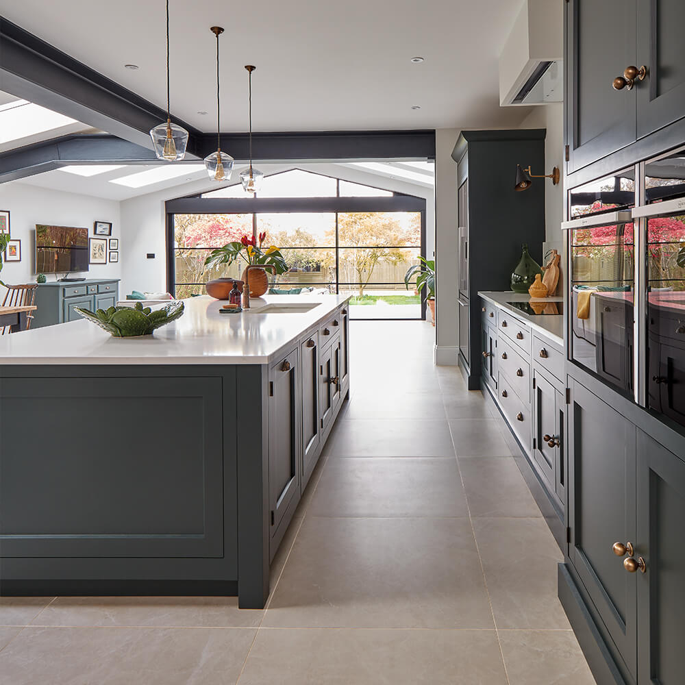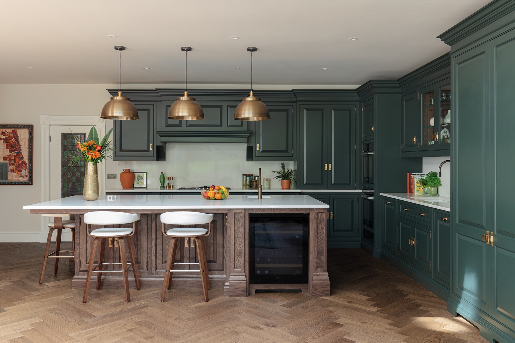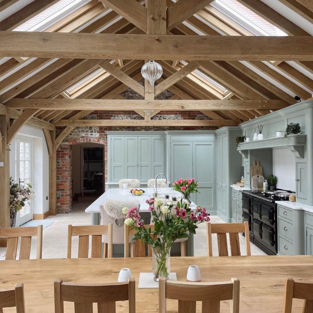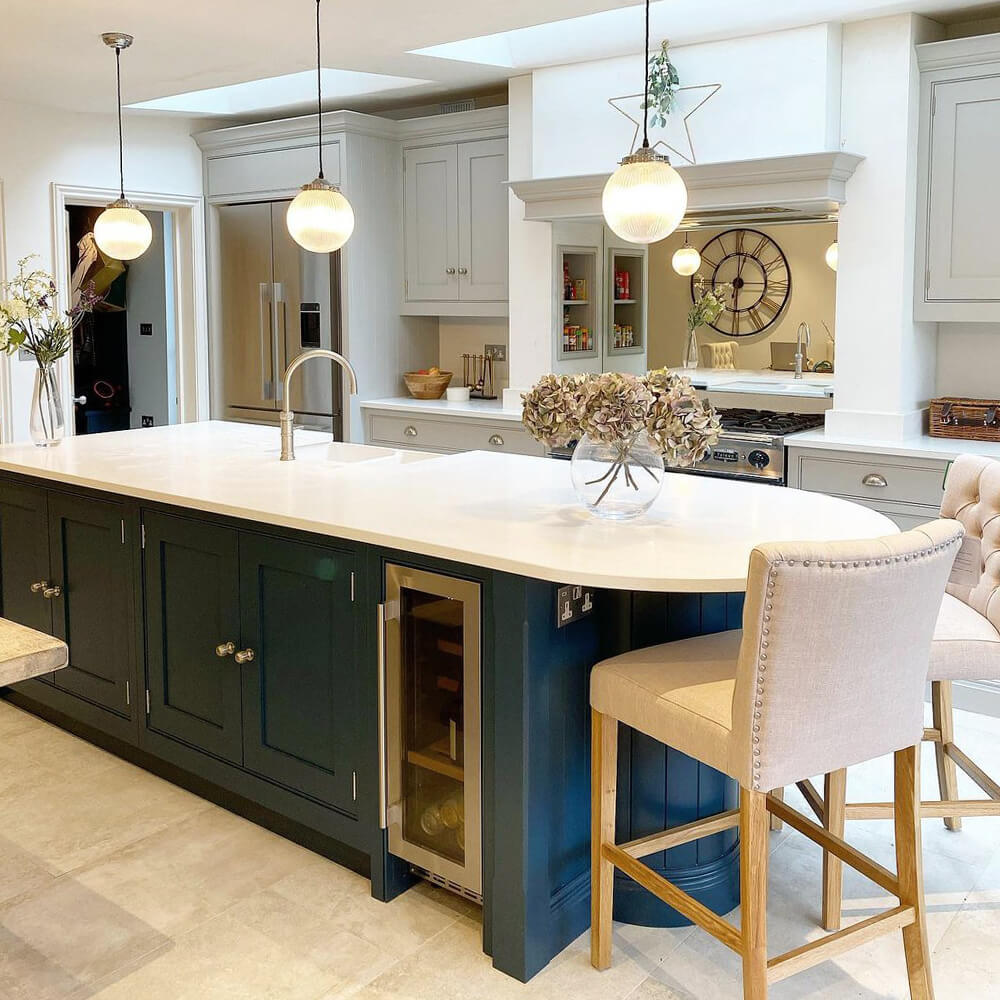 @redcliffhouse_renovation This impressive space has three main zones – a handcrafted kitchen with an island at its heart, a sociable dining zone, and a comfortable living area. Our distinctive colour, Avocado, was chosen, combined with warm oak internals and Caesarstone worktops.