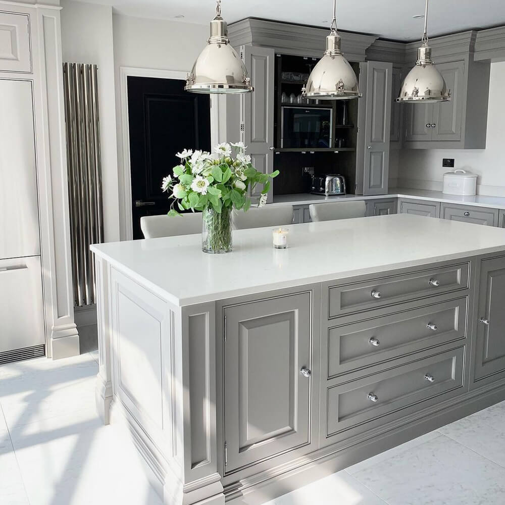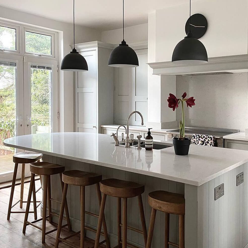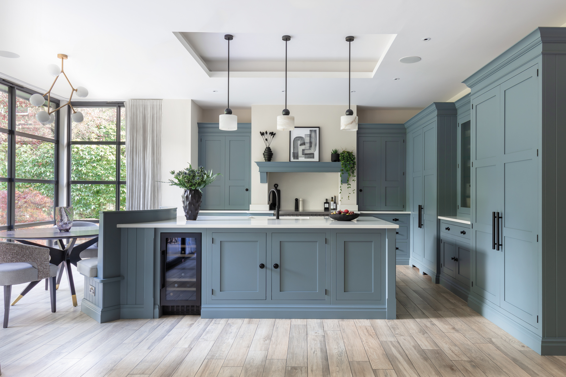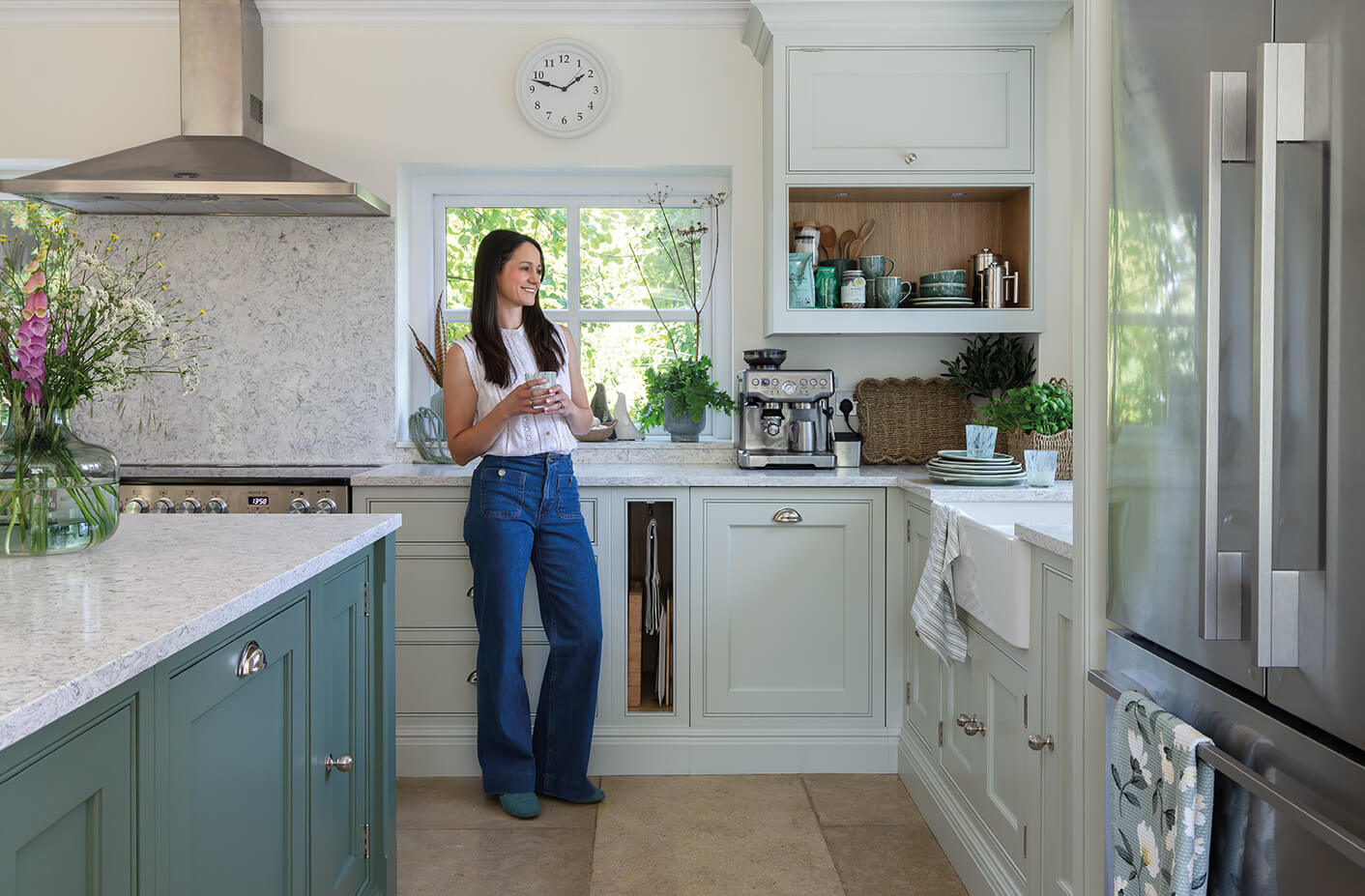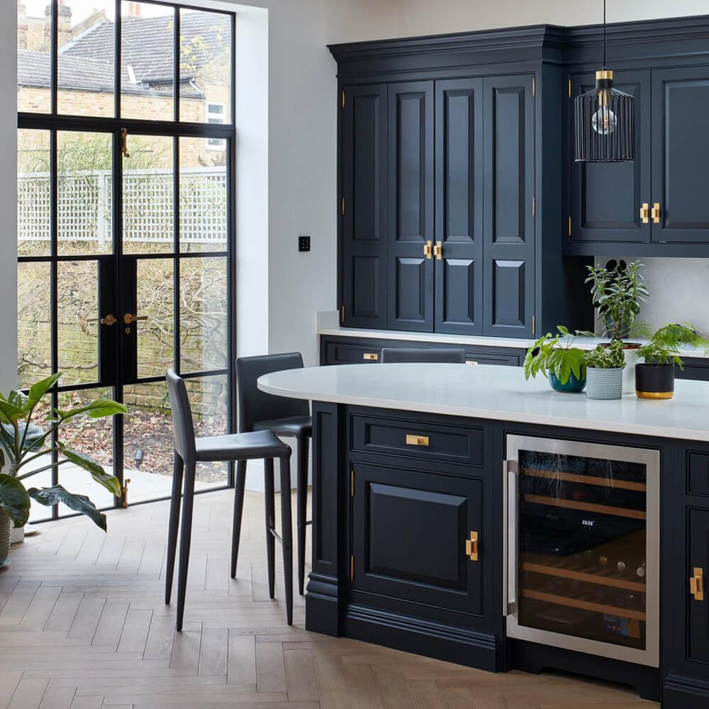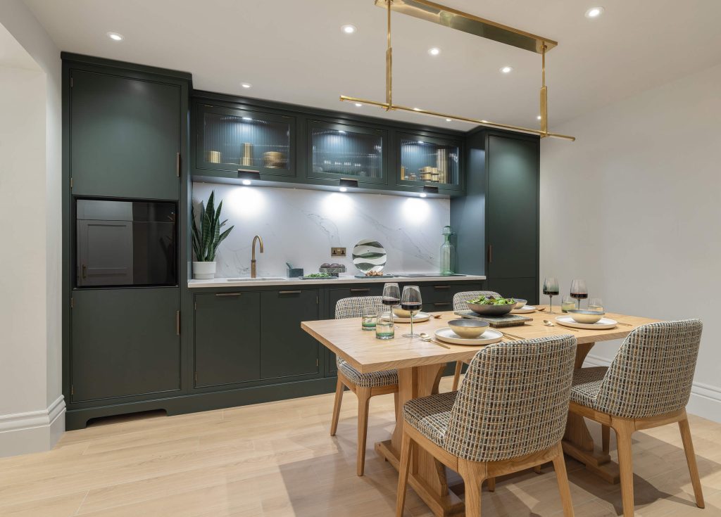 @redcliffhouse_renovation This impressive space has three main zones – a handcrafted kitchen with an island at its heart, a sociable dining zone, and a comfortable living area. Our distinctive colour, Avocado, was chosen, combined with warm oak internals and Caesarstone worktops.